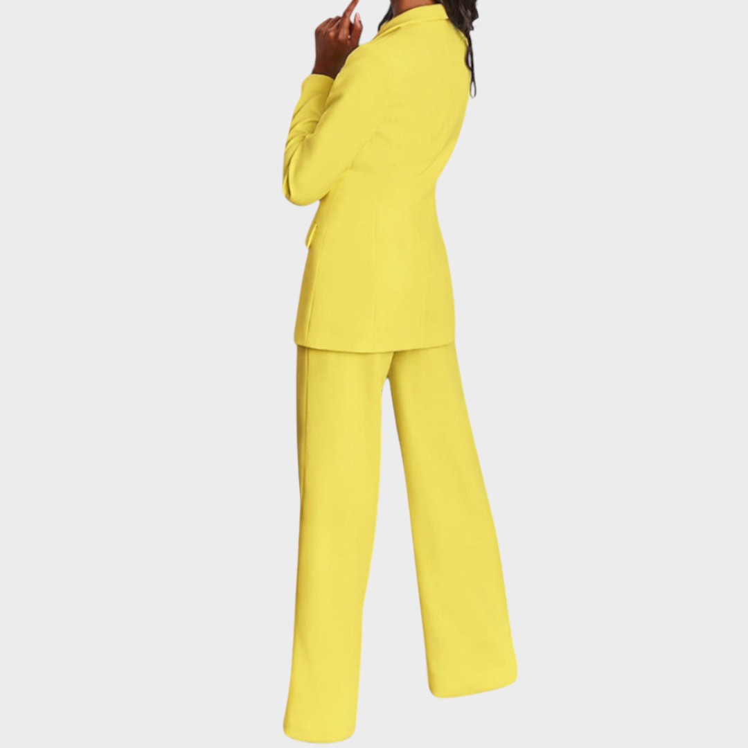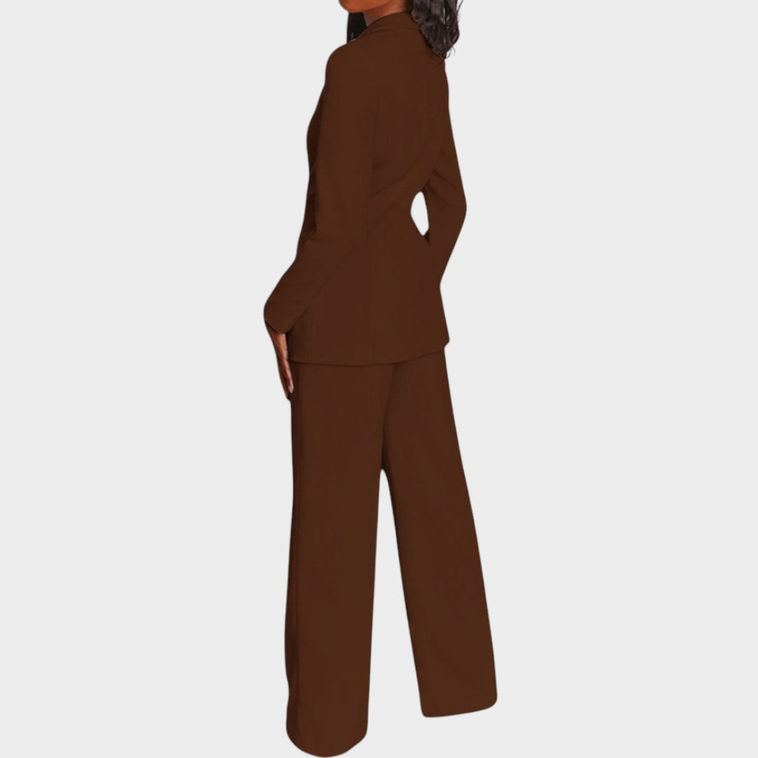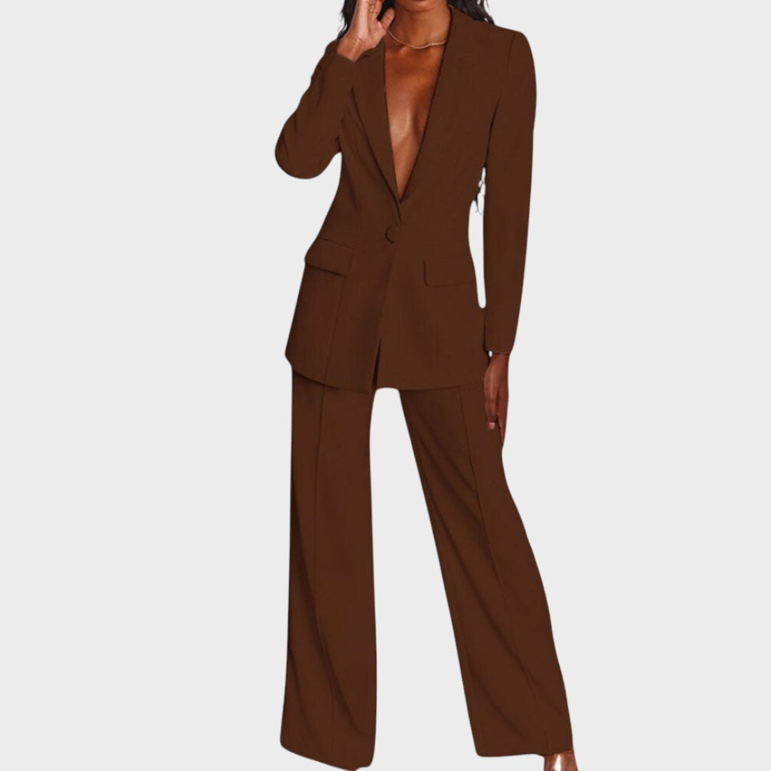 Žensko odijelo koje spaja profinjenost i moderan stav. Dugi blejzer sa špic-reverima, zatvaranjem na jedan gumb i džepovima s preklopom lijepo definira struk i vizualno izdužuje figuru. Hlače ravne, blago širokih nogavica s peglanom crtom osiguravaju čist, produžen profil i slobodu kretanja. Tkanina s lijepim padom pruža udobnost od jutarnjeg sastanka do večernjeg izlaska. Nosivo kao komplet ili odvojeno – jednako snažno u uredu, na eventu ili za svečanu večer.
